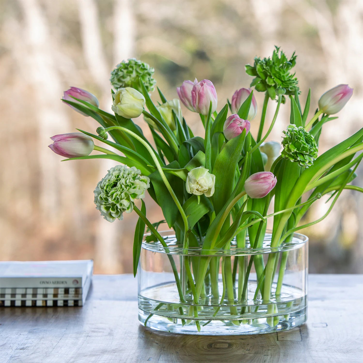 Die Vase besteht aus mundgeblasenem Klarglas.